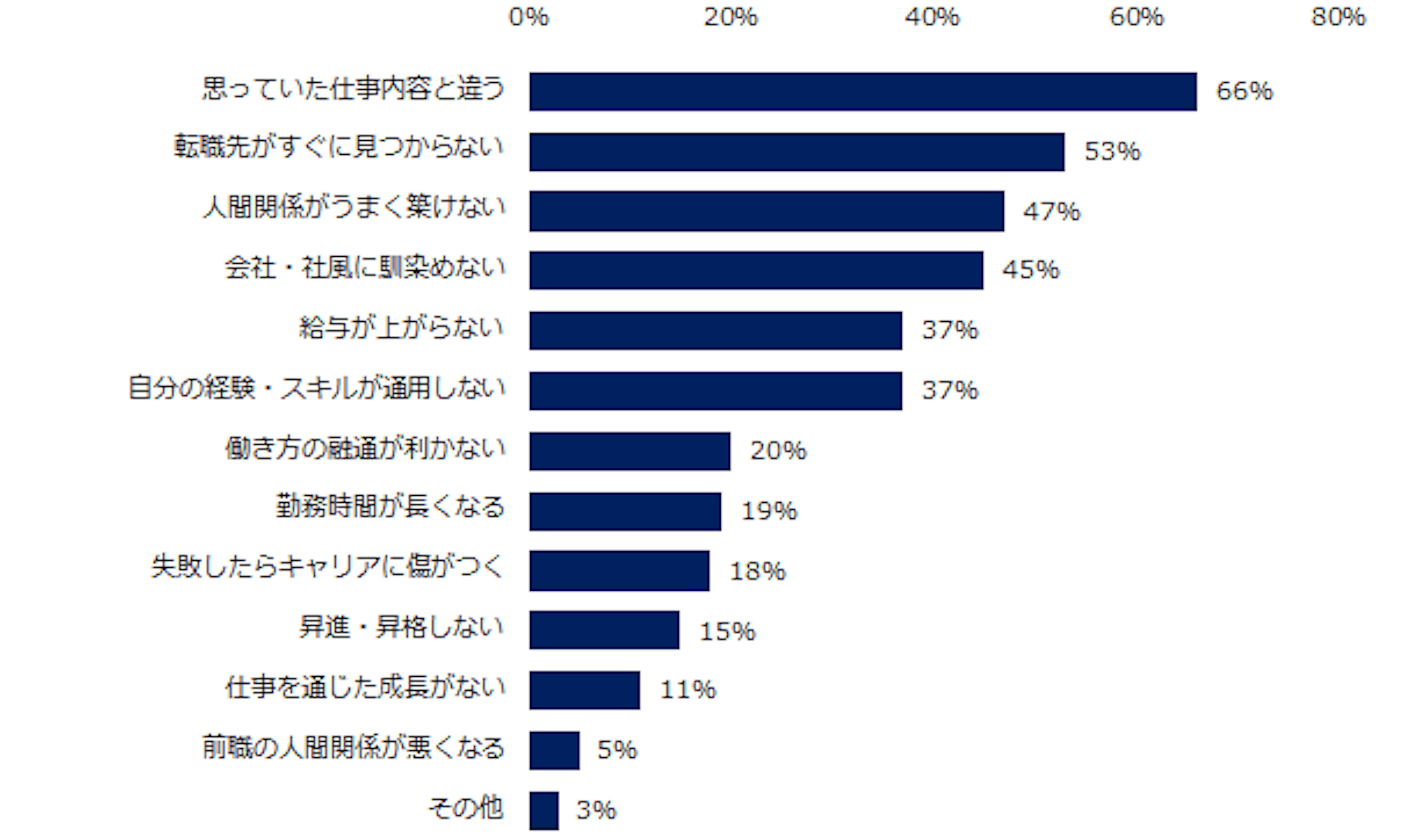 エンの調査によると、95%の人が転職することにリスクがあると考えていることが分かりました。そして、どんな点をリスクに感じるかについては1位が「思っていた仕事内容と違う」(66%)、2位が「転職先がすぐに見つからない」(53%)、3位が「人間関係がうまく築けない」(47%)という結果でした。下記では上位3位のリスクに感じる点について詳しく解説します。