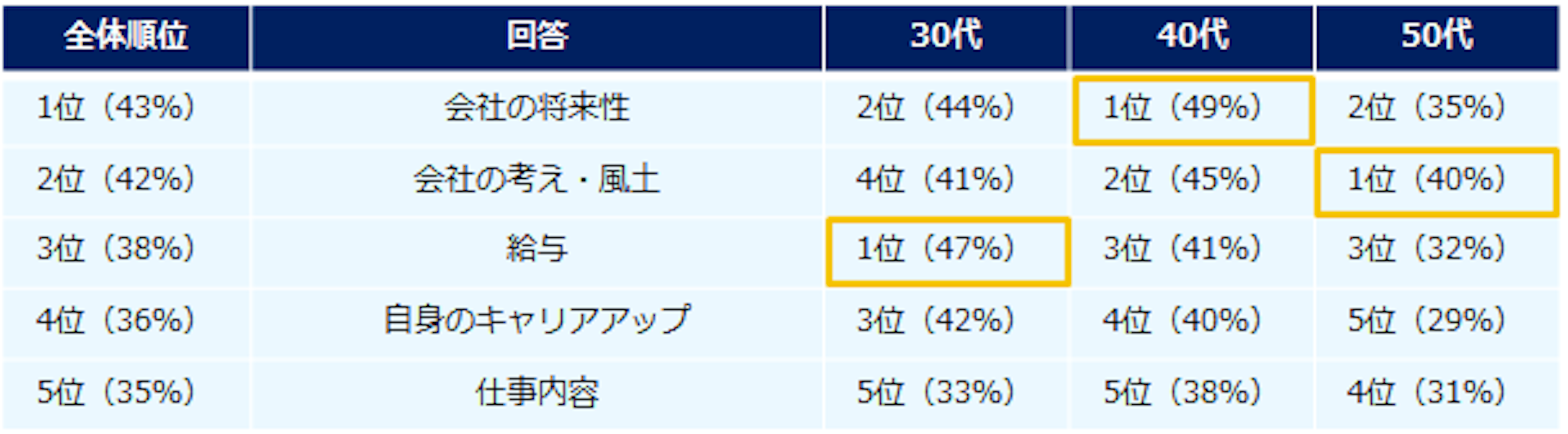 エンの調査によると、転職を考えるようになったきっかけ上位3位は、1位「会社の将来性」(43%)、2位「会社の考え・風土」(42%)、3位「給与」(38%)でした。しかし、年代別にみると、30代「給与」(47%)、40代「会社の将来性」(49%)、50代「会社の考え・風土」(40%)が1位であり、各年代でばらつきがあることが分かりました。