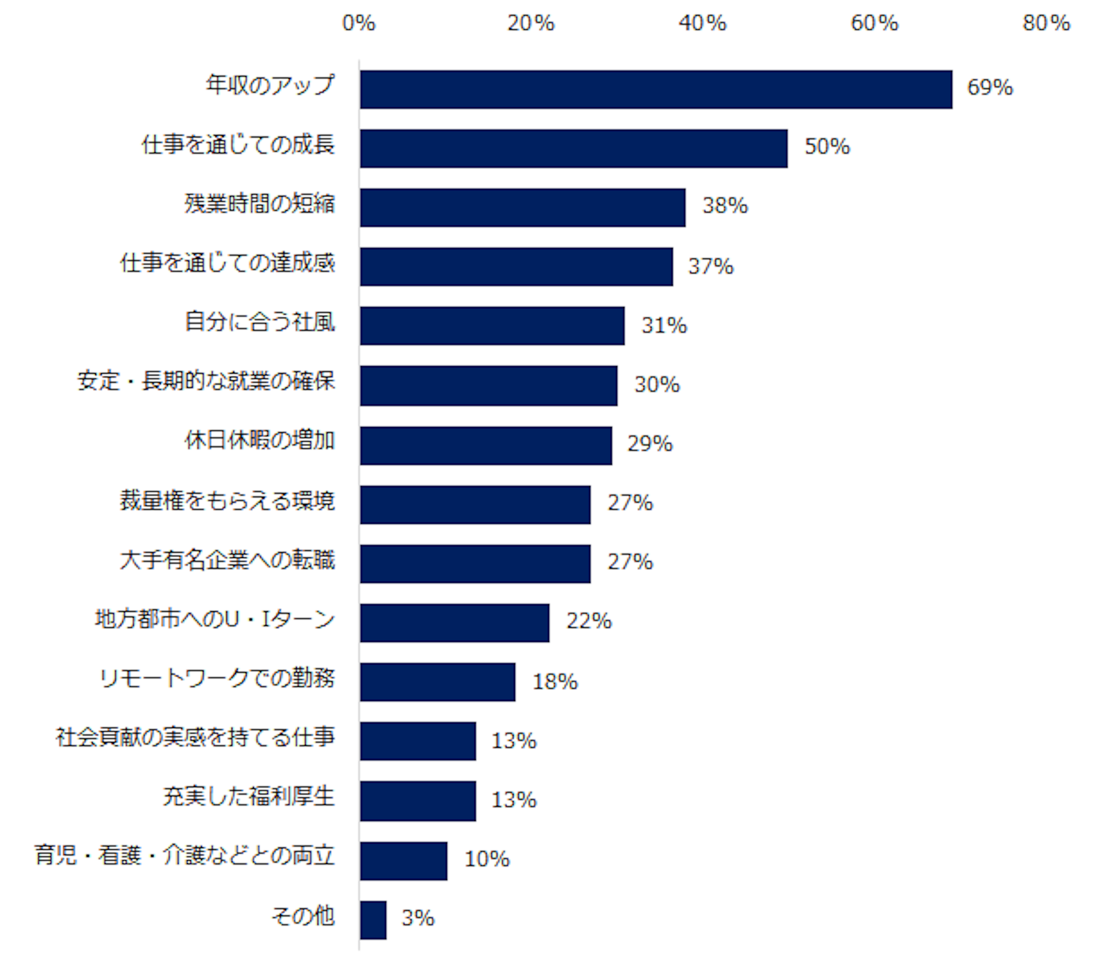 エンの調査によると、転職成功者が転職で叶えたこと第1位は「年収アップ」(69%)で、2位は「仕事を通じた成長」(50%)そして3位は「残業時間の短縮」でした。他にも様々なことを叶えているケースが存在するため、自分の叶えたい希望はあるかどうか確認してみてください。