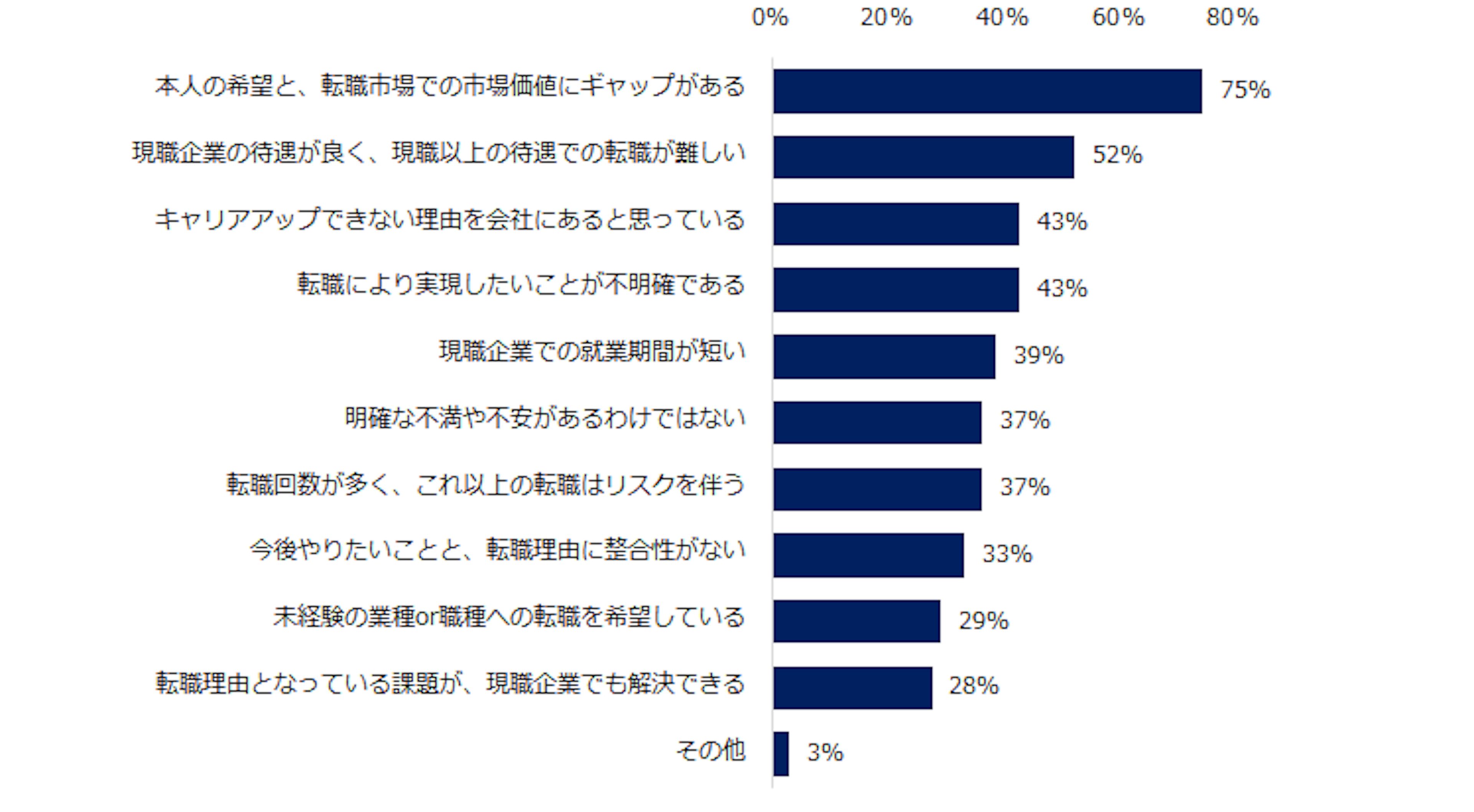 エンの調査によると、転職コンサルタントの考える現職にとどまるべき理由1位は「本人の希望と、転職市場での市場価値にギャップがある」(75%)で、2位は「現職企業の待遇が良く、現職以上の待遇での転職が難しい」(52%)そして3位は「キャリアアップできない理由を会社にあると思っている。」でした。以下では上位3位について詳しく解説します。